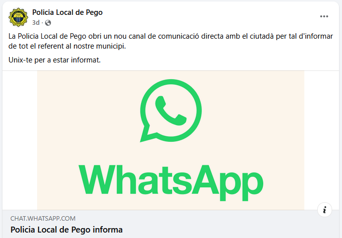 La Policia Local de Pego obri un canal de difusió de whatsapp