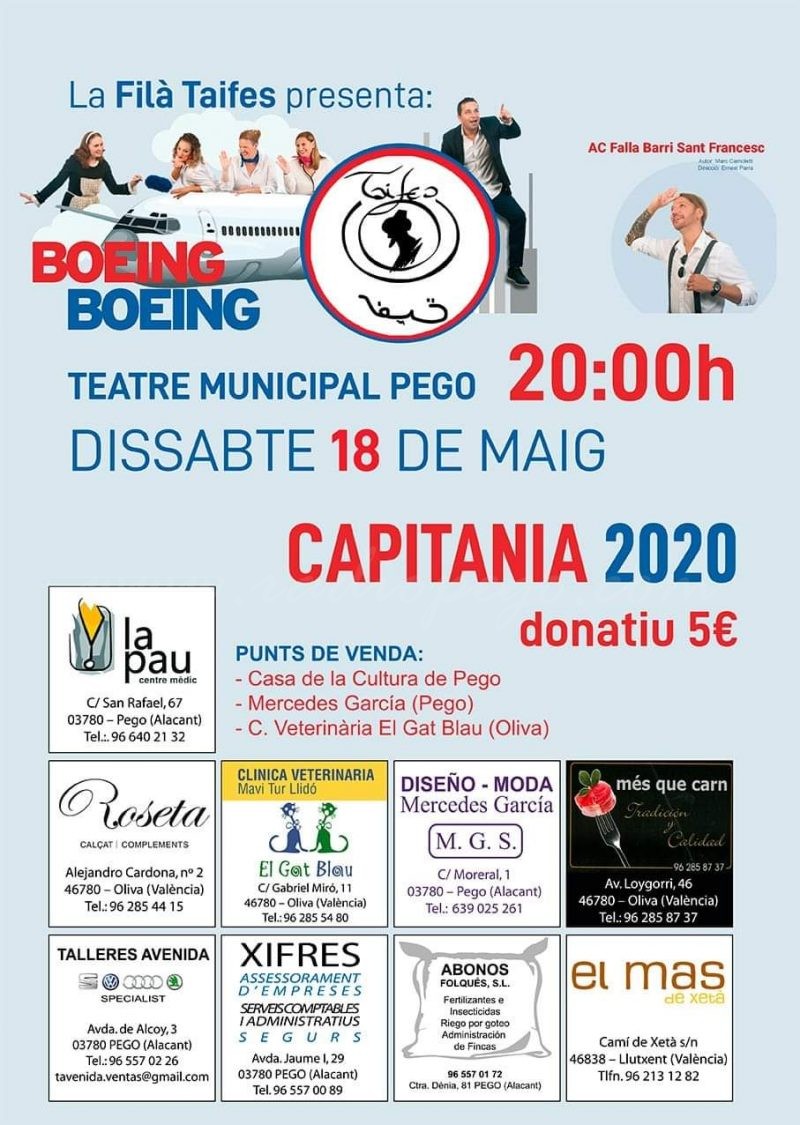 BOEING BOEING és una obra de l’autor francés Marc Camoletti que va estar en cartell durant anys en el Teatre Comedie Caumartin de París (és l’obra francesa més representada de la història) i després va tindre una versió en cine protagonitzada pels famosos Tony Curtis i Jerry Lewis i dirigida per John Rich.