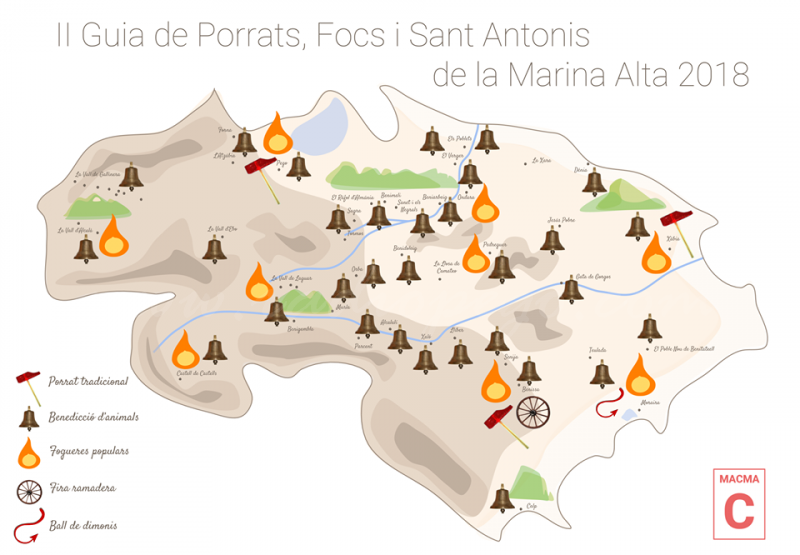 A la Marina Alta són molts els municipis on tenen marcats al calendari aquesta data. Pego, Benissa, Xàbia, Ondara, Pedreguer, Vall de Laguar… Són alguns dels pobles que organitzen fogueres, firetes, balls de dimonis, benediccions d’animals o els tradicionals porrats.