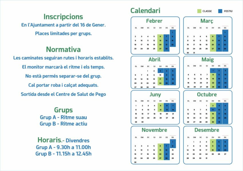 Per a poder abraçar el major nombre de gent possible, s’han creat dos modalitats de caminada, una de ritme suau, que s’iniciarà a les 9:30h i finalitzarà a les 11:00h i una segona de ritme actiu, que començarà l’activitat a les 11:15h i la finalitzarà a les 12:45h. Totes les eixides es faran des del centre de salut de Pego.