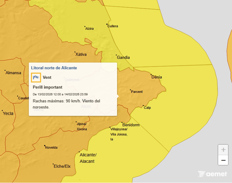 L’AEMET ha decretat avís taronja des de les 12 del migdia de divendres fins a les 23:59h de dissabte 14 de febrer, dia en que Pego celebra el Carnestoltes enguany. Este avís significa que les ràfegues de vent poden superar els 90 quilòmetres per hora. Tot i que seguiran de prop l’evolució meteorològica, a hores d’ara, la regidora de Festes afirma que “per ara tot seguix avant i no anul·larem el Carnestoltes”.