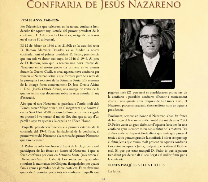 n la casa del rector Ramon Martínez Penadés, segons es desprèn de l’article publicat en el llibre de Setmana Santa. Pedro Sendra González, metge de professió, va ser el primer en ostentar el càrrec de president de la confraria de Jesús Natzarè. Hi va estar tres anys al capdavant, de 1946 a 1949.