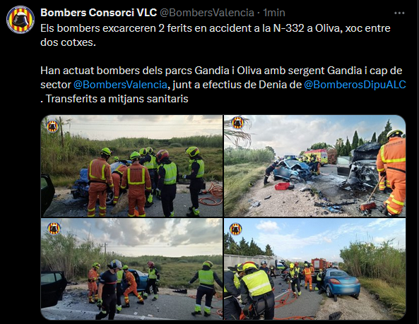 Fa uns minuts el consorci de Bombers de València ha informat d’un accident de trànsit entre dos vehicles, a la N-332 al seu pas pel terme municipal d’Oliva.