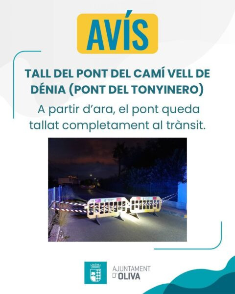 Anit l’Ajuntament d’Oliva anunciava en xarxes socials el tancament total del pont del ‘Tonyinero’. Especificava el consistori de la Safor que «el pont queda tancat completament al trànsit, tant per a vehicles com per a bicicletes i vianants».