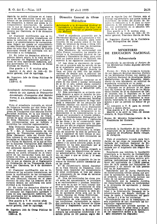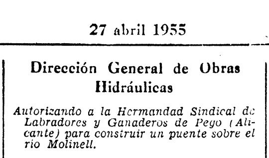 La Germandat Sindicat de Llauradors i Ramaders de Pego va remetre «una pòlissa de 150 pessetes […] més el recàrrec complementari» per poder començar les obres. El pont, indica la publicació del BOE, «es dedicarà al servei públic».