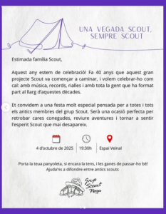 Per celebrar eixa sintonia, eixa dedicació i el que vindrà, han organitzat l’esdeveniment d’este dissabte 4 d’octubre. “Una festa oberta a tot el poble”. Però des del Grup Scout de Pego es fa una crida a “totes les persones que han format part del Grup” perquè tenen ganes de “compartir aventures, retrobaments amb companys de patrulla i, sobretot, que s’ho paren d’allò més bé”. La festa comptarà amb l’actuació de Gluten Free, de la que formen part dos antics scouts i que “han preparat una sorpresa”. També hi haurà tallers per als més menuts i menudes perquè també “puguen gaudir de la festa”. En definitiva un conjunt d’activitats per deixar un bon sabor de boca d’estos 40 anys de vida del Grup Scout Pego.
