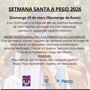 Patro Ceresola Saez és enguany l’encarregada d’anunciar l’inici de la Setmana Santa pegolina, “una persona molt involucrada dins de les dos parròquies”, assenyala el president de la Junta Central de Setmana Santa. Diumenge arriba una de les cites importants, Diumenge de Rams, a partir de les 10:45h des de la plaça del Mercat.