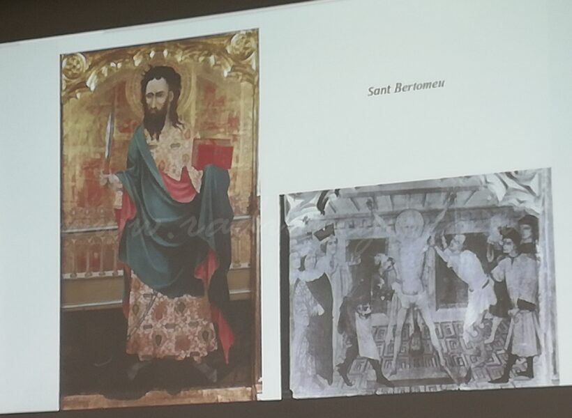 L’obra apareix en els primers documents titulada com a ‘La Mare de Déu, Sant Bartomeu i Santa Caterina’, “les tres advocacions completes” que es veuen representades en els tres carrers del retaule, informa Carme Llanes.