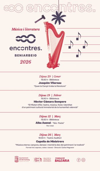 Des de 2014 la Marina Alta té una cita cultural als ‘Encontres a Beniarbeig‘. Una cita anual que permet reflexionar sobre les múltiples connexions que la literatura té amb altres camps que permeten la retroalimentació. Enguany aprofundirà sobre l’estreta relació que esta té amb la música.