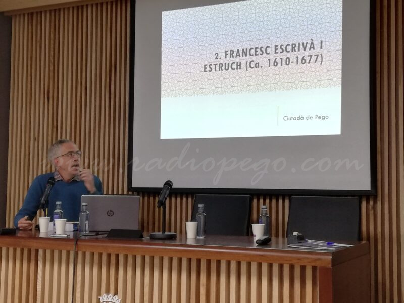 La família Escrivà va protagonitzar la primera conferència de les IX Jornades d’Estudis Carmen Giner Bolufer que es van celebrar a la Casa de Cultura de Pego el passat 26 i 28 de novembre. Originària de la Font d’En Carròs, va ser “una família molt poderosa, segurament una de les més poderoses de Pego en la segona meitat del segle XVII perquè “tenien poder econòmic, sobretot, però també tenien poder social“. Un tercer poder que està encara per estudiar és el polític, tot i que el doctor en Història Moderna, Frederic Barber Castellà, intuïx que el tenien.