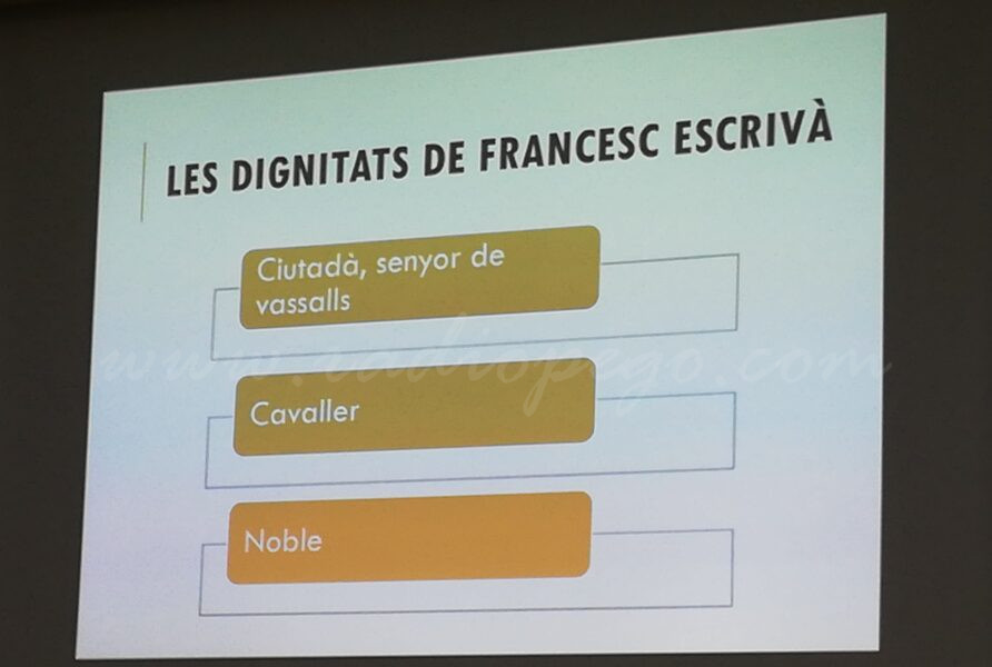 Francesc Escrivà, com a ciutadà de Pego, va comprar dos senyories, la de Favara i la de Benirredrà. Era una manera d’accedir a la noblesa, tot i que no sempre s’aconseguia. No obstant això, amb la compra s‘aconseguia ser senyor de vassalls, el que “posava en contacte directe amb la noblesa, apunta Francesc Barber. Finalment, però, en el cas que ens ocupa, Francesc Escrivà sí que accedirà a la noblesa, serà noble de privilegi perquè compra una dignitat. Escriviu al rei, a través delConsell d’Aragó, que és l’intermediari, primer demanant un títol de cavaller i després en demana un de noble“.