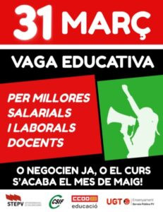 A l’educació pública hi ha un sentiment generalitzat d’abandonament. Tenen la sensació que a la Conselleria no li preocupa “gens” l’ensenyament públic. I en pobles valencianoparlant com el nostre, se li afegix que tota la documentació l’envien en castellà, obviant la realitat bilingüe d’on vivim i la cooficialitat idiomàtica. Estos són alguns dels motius que ha mobilitzat els sindicats per a convocar hui, 31 de març, vaga en l’educació pública.