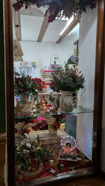 Qui passe per davant de Flors Mandràgora podrà vore una base de “molses, avets i altres plantes referents al Nadal” que és el que ara més es treballa a la botiga. A més, detallava que dels complements de l’aparador “l’únic artificial són les boles que interpreten la màgia del Nadal, la resta són materials naturals amb els que nosaltres intentem fer paisatges menuts, boscos menuts, per donar un toc màgic“.