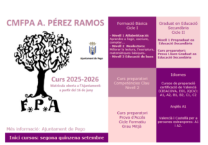 L’oferta inclou cursos de valencià i castellà per a persones estrangeres en els nivells A1 i A2, anglés A1 i cursos de preparació per a la certificació de valencià de tots els nivells. A més, l’FPA prepara per a la prova d’accés al graduat en educació secundària (ESO), la prova d’accés a cicle formatiu de grau mitjà. Així mateix, oferix formació bàsica d’alfabetització, neolectura i educació de base. Les matricules es poden fer a la planta baixa de l’Ajuntament de Pego o a través de la seu electrònica.