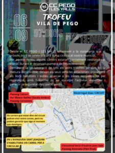 El Club Ciclista Pego i Les Valls organitza este dissabte, 6 de setembre el Trofeu Vila de Pego en modalitat de carretera i per a les categories d’aleví, cadet femení, infantil, júnior femení, principiants i promeses. La competició està inscrita en la Federació Valenciana de Ciclisme el que significa que, a més de pegolins i pegolines, s’espera una participació important de xiquets i xiquetes d’altres localitats de la resta de la Comunitat Valenciana.