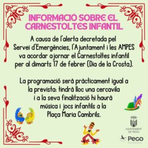 Més sort ha tingut el Carnestoltes Infantil perquè es va poder ajornar degut a què “els grups que participaven i la infraestructura que s’havia contractat” podien actuar i desplaçar-se este dimarts, 17 de febrer, a Pego. Una vegada això assegurat, la regidora de Festes va contactar amb les AMPA que “ho van vore una bona opció ja que era el dia de la Crosta i era festiu”. Una manera “d’apostar pel nostre dia i donar-li una celebració diferent”.
