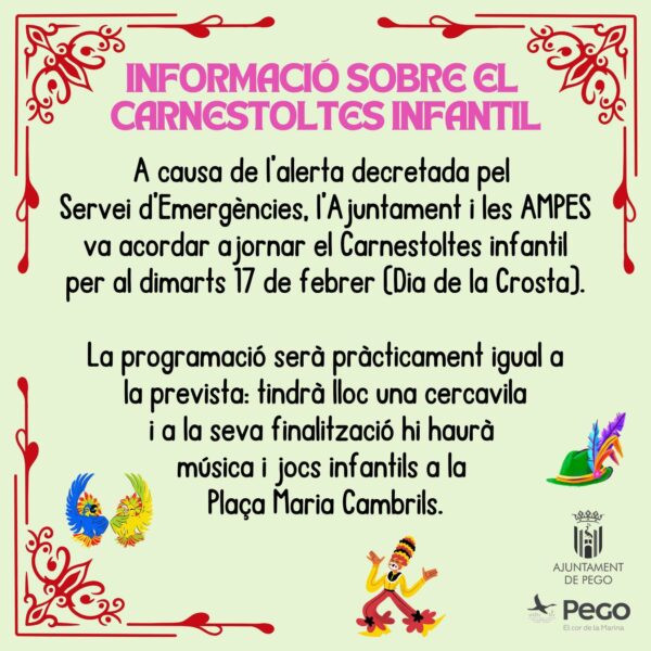 Així les coses, dimarts 17 de febrer, festiu a Pego per la celebració del dia de la Crosta, tindrà lloc el Carnestoltes Infantil amb l’inici de la cercavila a les 16:30h, des de la plaça de l’Ajuntament fins a la plaça Maria Cambrils. El recorregut fins allí serà: plaça Mayorazgo Cendra, carrer Ramón i Cajal, plaça Poeta Llorente, avinguda Jaume I i plaça Maria Cambrils. En finalitzar la desfilada, actuarà Marcel, el Marcià, a més hi haurà unflables i altres jocs infantils per poder passar una vesprada de Carnestoltes ben entretinguda.