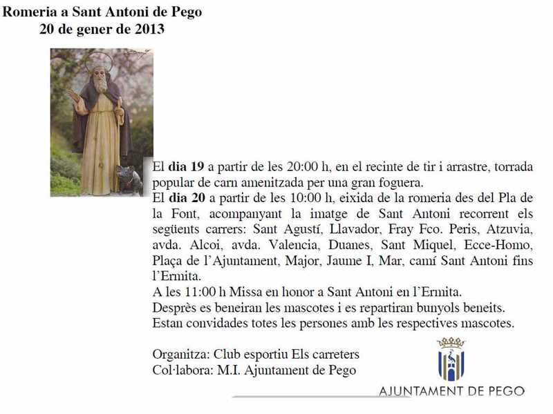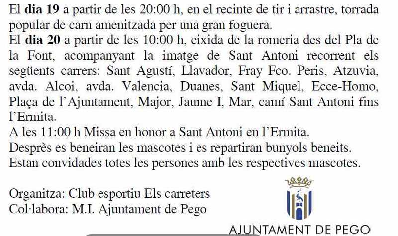 D’ahí que associacions com el Club esportiu Els Carreters de Pego li tinguen tanta devoció i hagen fet de la romeria de Sant Antoni tot un esdeveniment. No obstant, la festa per a ells comença dissabte a poqueta nit. Cap a les 20 hores es reuniran al camp de tir i arrossegament al voltant d’una gran foguera per passar una estona animada i en bona companyia. Allí torraran per a sopar unes bones xulles que compartiran en tot el món que els vullga acompanyar.