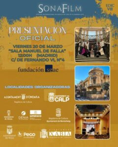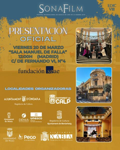 Pego tornarà a ser una de les seus del Sonafilm, el festival de música cinematogràfica que té lloc a la Marina Alta durant el mes d’agost. Ho ha confirmat el regidor de Turisme, Ricardo Sendra. Este divendres, 20 de març, té lloc la presentació oficial de la huitena edició a Madrid, a la seu de la Fundació SGAE. Una cita a la que el festival arriba amb una imatge renovada per a l’ocasió.