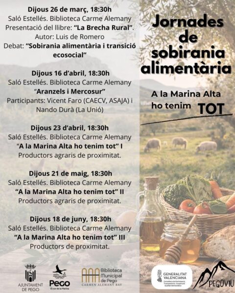 Amb el títol ‘A la Marina Alta ho tenim tot’ el col·lectiu en Defensa del Territori mostra la seua aposta pel producte local i de proximitat. Les jornades estan pensades a llarg termini amb l’objectiu de repensar el model productor i alimentari més pròxim. Estes combinaran xarrades, tallers i taules rodones amb les veus del sector com a protagonistes. Un espai pensat des de Pego Viu per a “compartir experiències i buscar solucions” de manera col·lectiva.