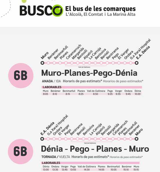 La línia 6B de BUSCO unix Muro amb Dénia passant per la Vall de Gallinera, Pego, El Verger, Ondara i l’Hospital. No obstant això, esta línia no sumarà un nou horari a Pego per a poder anar a Dénia o tornar. Sí que podrà baixar a Pego gent que vinga de Muro o de la Vall de Gallinera. Així mateix, la gent de Pego podrà agafar esta línia per anar a la Vall de Gallinera o a Muro. No obstant això, la població de Pego no podrà accedir a l’autobús per a viatjar fins a Dénia.