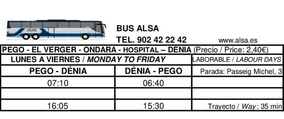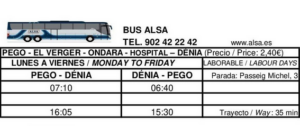 Així les coses, el trajecte Pego-Dénia i vicerversa continua tenint només dos horaris d’anada i dos de tornada que són els que oferix ALSA. L’autobús ix de Pego cap a Dénia a les 07:10h i a les 16:05h i que ve de Dénia a Pego a les 06:40h i a les 15:30h.